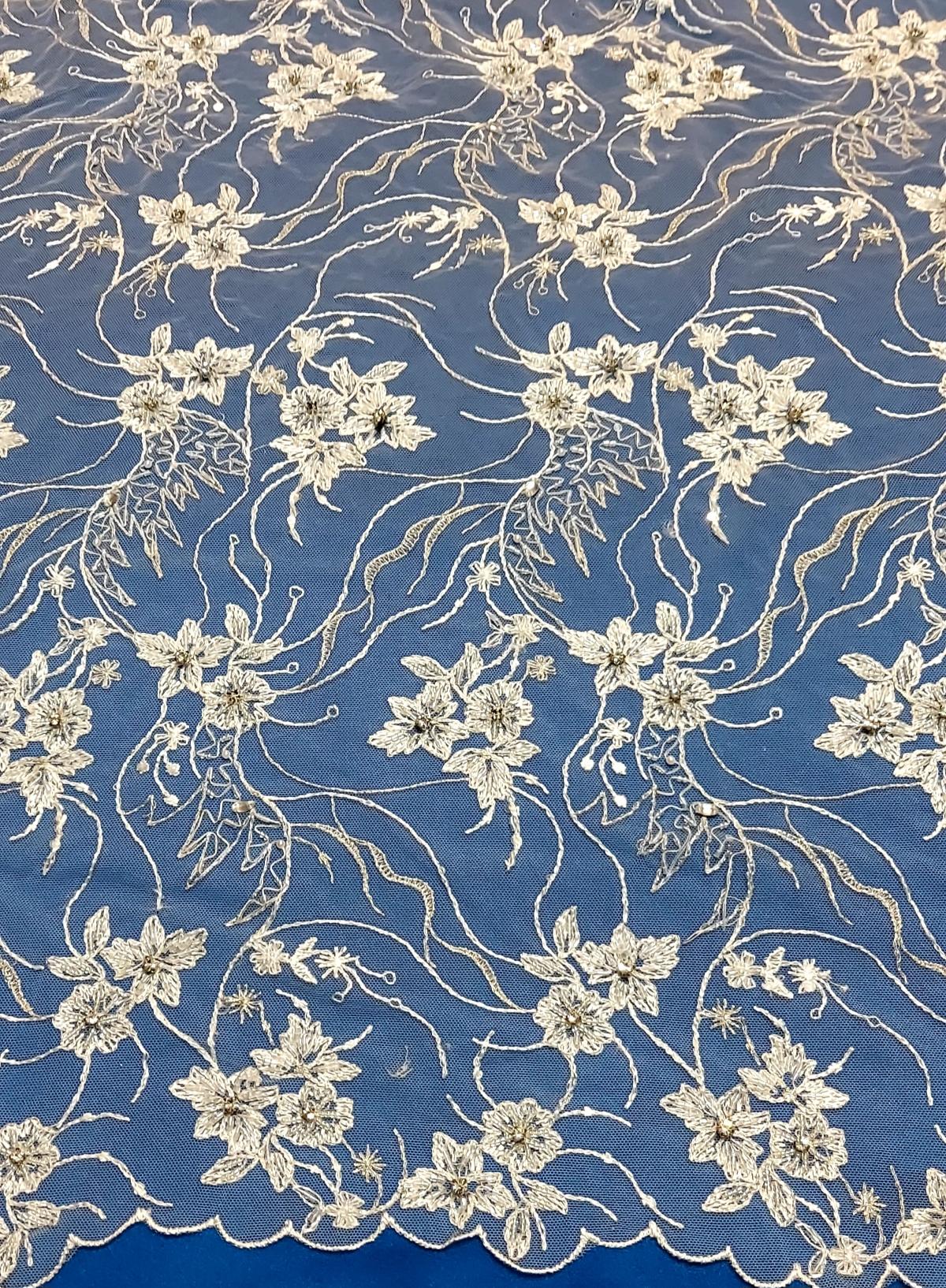 Koronka ślubna, zdobiona koralikami,dzetami oraz srebrną niteczką